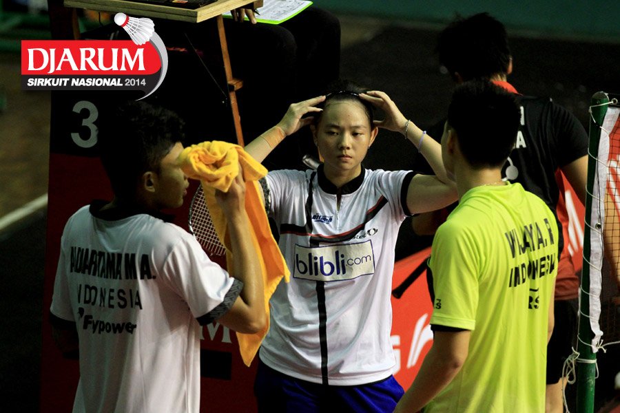 Arya Maulana/Della Augustia (Djarum Kudus) saat mendapatkan pengarahan dari Rendra Wijaya