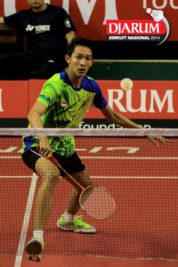I Putu Riy Danu (Semen Gresik) mengembalikan shuttlecock ke arah Rifan Fauzin (Pelatnas)