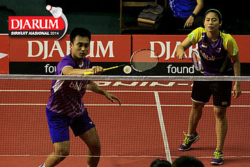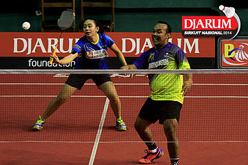 Ridho Akbar/Sri Wulan (Halim/Jaya Raya) bersiap menyambut pengembalian dari Trikus Haryanto/Keshya Nurvita Hanadia (Tjakrindo Masters/SGS PLN)