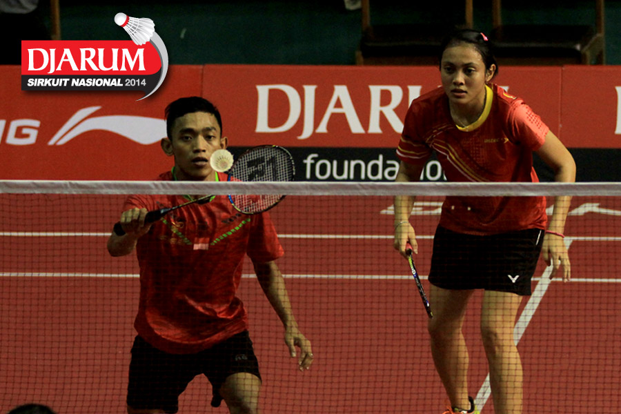 Hafiz Faisal/Shella Devi (Pelatnas) menyambut serve dari Arsya Isnanu/Nurbeta Kwanrico (Djarum Kudus)