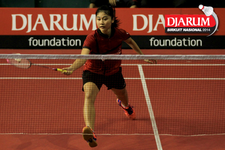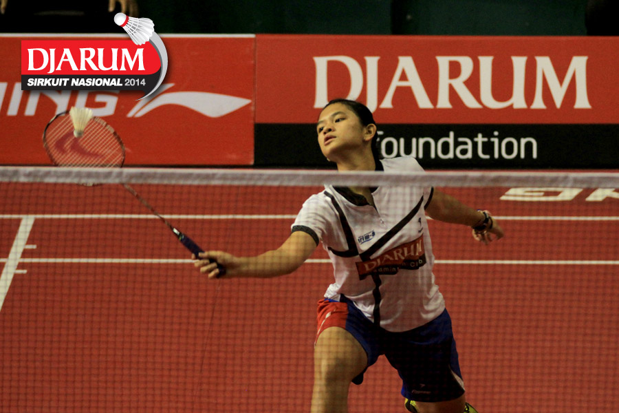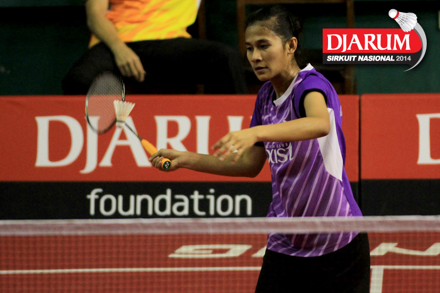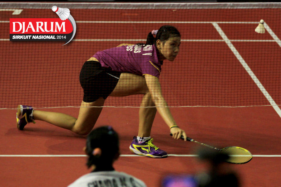 Marsa Indah (Djarum Kudus) mengembalikan shuttlecock ke arah Erlina Kurniati (Sarwendah)