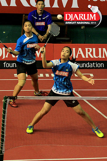 Linda Mutiara/Shinta Arum (Mutiara Cardinal) mengembalikan shuttlecock ke arah Lya Ersalita/Syifa Fauziah (Jaya Raya)