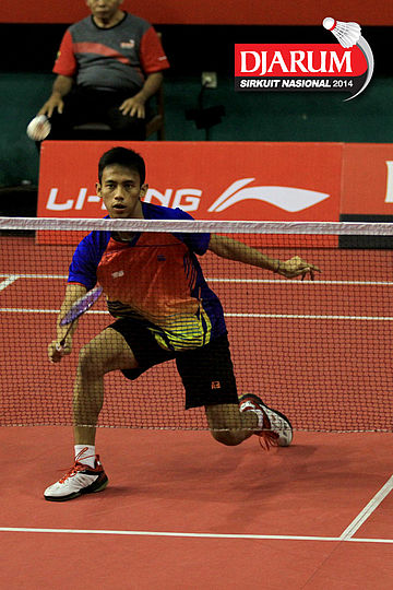 Krisna Adi (Jaya Raya) mengembalikan shuttlecock ke arah Vicky Angga Saputra (Tangkas)