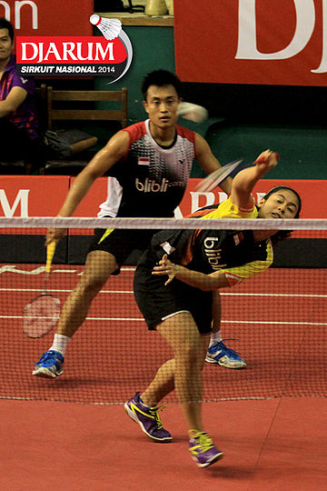 Trikus Haryanto/Keshya Nurvita Hanadia (Tjakrindo Masters/SGS PLN) mengembalikan shuttlecock ke arah Hafiz Faisal/Shella Devi (Pelatnas)