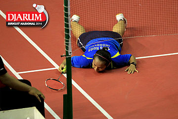 Tays Rona (Citra Raya Unesa) harus terjatuh saat berusaha menghadang serangan yang dilepaskan Fachryza Abimanyu/Syifa Fauziah (Jaya Raya)