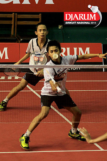 Dicky Cahya/M. Taufiqul (Djarum Kudus) bersiap menyambut pengembalian dari Bagas Maulana/Calvin Kristanto (Djarum Kudus)