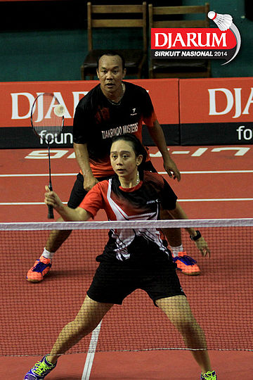 Hafiz Faisal/Shella Devi (Pelatnas) menyambar pengembalian dari Trikus Haryanto/Keshya Nurvita Hanadia (Tjakrindo Masters/SGS PLN)