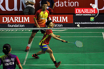 Yusril Argya/Peni Lanjarsari (Suryanaga Surabaya) mengembalikan shuttlecock