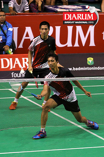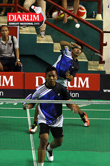 Rahmat Erwan/Suprapto (BOCEL) mengembalikan shuttlecock