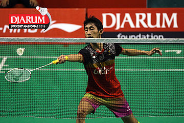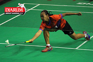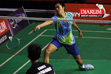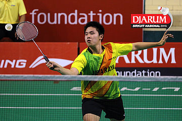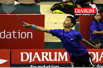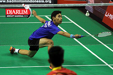 Wisnu Yuli (Djarum Kudus) mengembalikan shuttlecock
