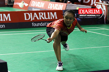 Tria Nur (Pusdiklat Telkom Jabar) mengembalikan shuttlecock