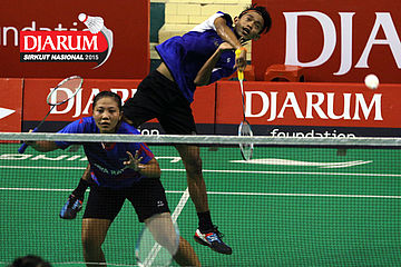 Trikusuma Wardhana/Meiliana Jauhari (Exist/Djarum Kudus) mengembalikan shuttlecock