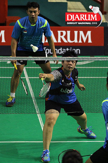 Ridho Akbar/Ery Octaviani (Halim/Jaya Raya) melepaskan serangan