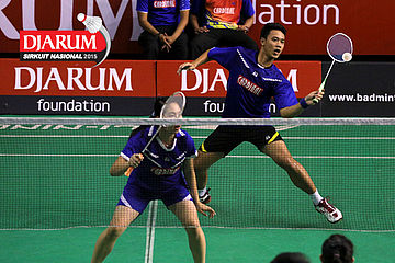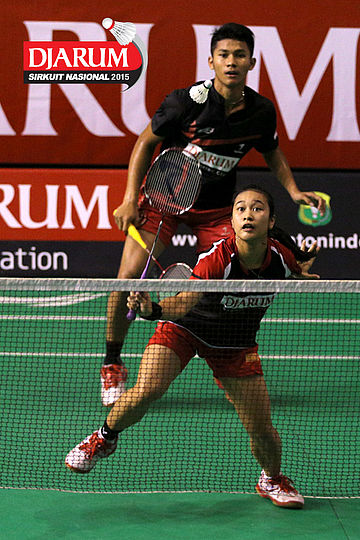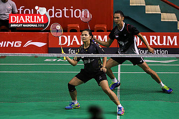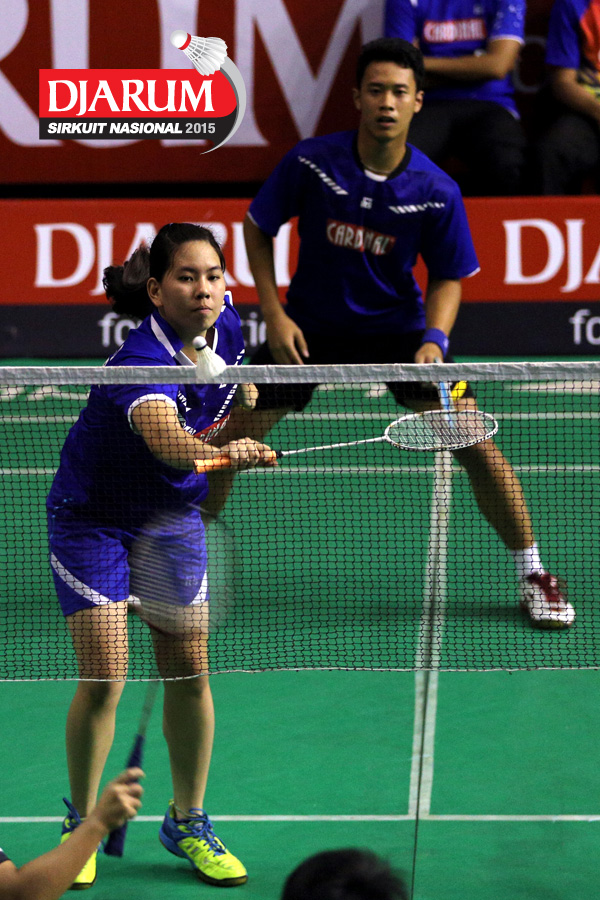 Ardy Nugroho/Lisa Ayu (Djarum Kudus) bersiap menyambar pengembalian