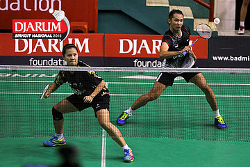 Fran Kurniawan/Komala Dewi (Djarum Kudus) bersiap menghadang serangan
