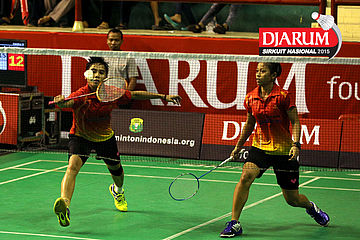 Meiliana Jauhari/Vita Marissa (Djarum Kudus) bersiap menyambut pengembalian