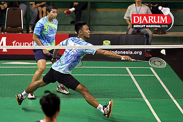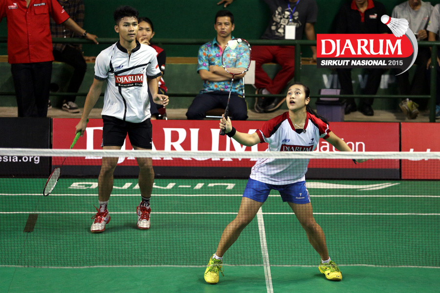 Ardy Nugroho/Lisa Ayu (Djarum Kudus) mengembalikan shuttlecock.