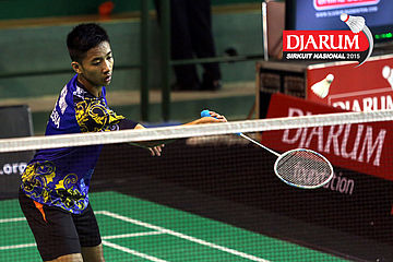 Dejan Ferdinansyah (Bintang BC) mengembalikan shuttlecock.