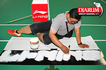 Salah satu pekerja saat memasang dekorasi Djarum Sirkuit Nasional 2014