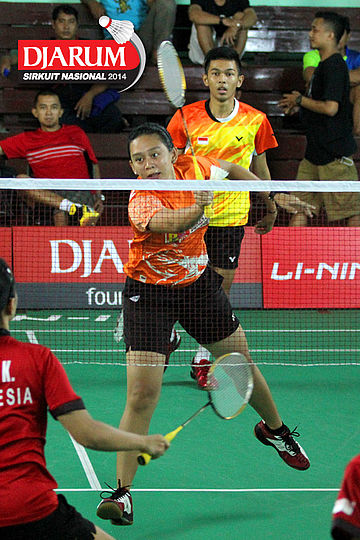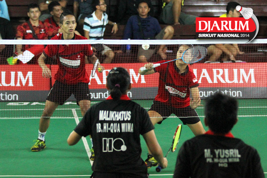 Hantoro/Deariska Putri (PB Djarum) menyambut serve dari Indra Setiawan/Ganis Nurrahmandani (Pertamina)