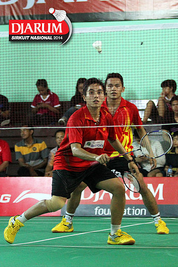 Fajar Alfian/Keshya Nurvita Hanadia (SGS PLN) menyambar pengembalian dari Ricky Alverino/Komala Dewi (PB Djarum)