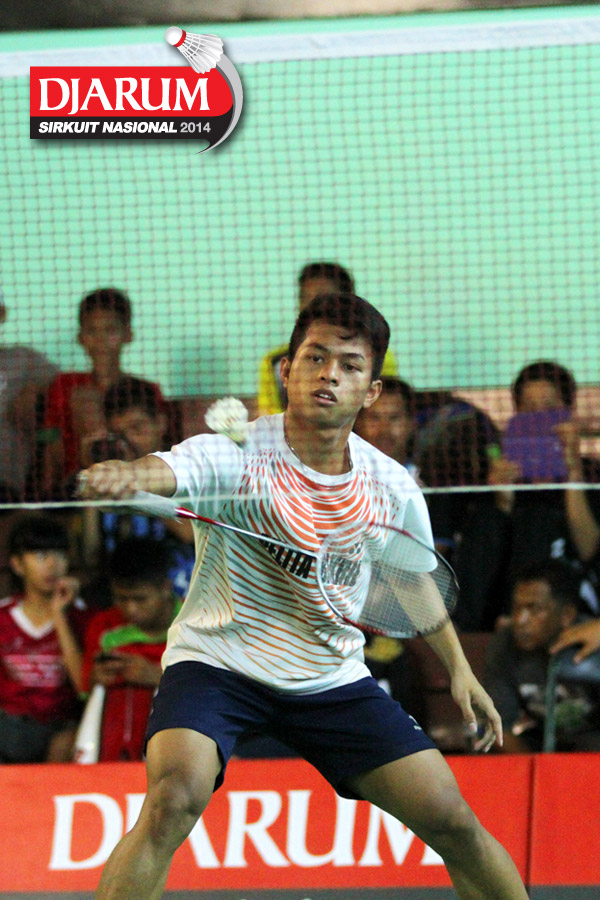 Rizky Ariandy (Pelatprov PBSI DKI Jakarta) mengembalikan shuttlecock ke arah Krishna Adi (Jaya Raya Suryanaga)