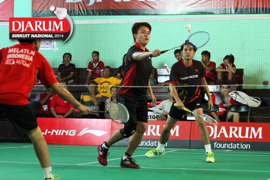 Arsya Isnanu/Nurbeta Kwanrico (PB Djarum) mengembalikan shuttlecock ke arah Rio Adiatma/Sessaria (Bintang Perkasa)