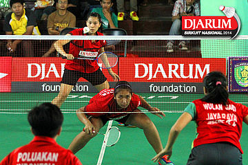 Rofahadah Supriadi/Syafitri Nur Azizah (PB Djarum) bersiap menyambut pengembalian dari Nisak Puji/Rika Rositawati (Mutiara Bandung)