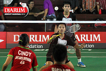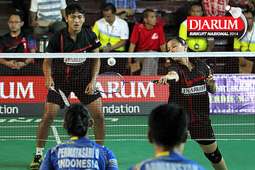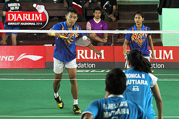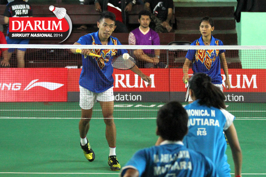 Arsya Isnanu/Nurbeta Kwanrico (PB Djarum) mengembalikan shuttlecock ke arah Ardiansyah Putra/Devi Tika Permatasari (Berkat Abadi/SGS PLN)