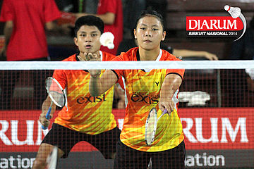 Fauzi Habibi/Apriyani Rahayu (Pelatprov PBSI DKI Jakarta) bersiap menyambut pengembalian dari Richard Kuncoro/Meirisa Cindy (Jaya Raya Suryanaga)