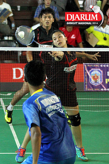 Rizky Hidayat/Nadya Melati (Hi Qua Wima/Pertamina) bersiap menghadang pengembalian dari Fajar Alfian/Keshya Nurvita Hanadia (SGS PLN)
