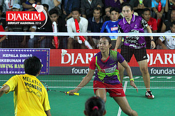 Dianita Saraswati/Yulfira Barkah (Mutiara Bandung) mengembalikan shuttlecock ke arah Fitria Ayu/Nabila (Semen Gresik)