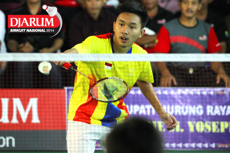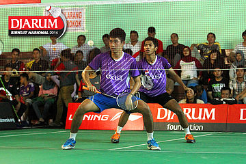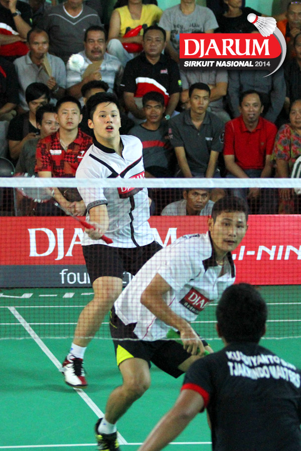 Hantoro/Kenas Adi (PB Djarum) berhasil menghadang serangan yang dilepaskan Rahmat Adianto/Seiko Wahyu (Tjakrindo Masters)