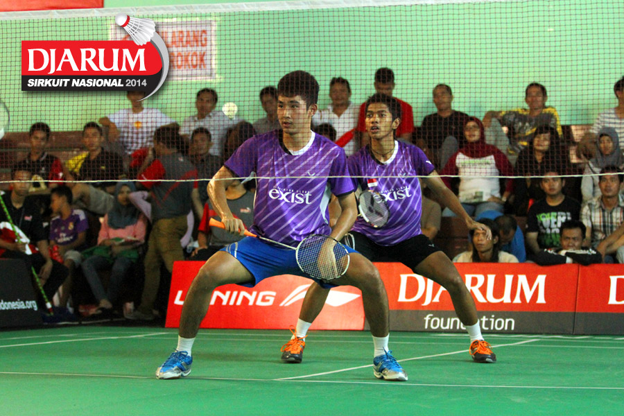 Franky Wijaya/Sabar Karyaman (Exist) bersiap mengembalikan shuttlecock ke arah Alwi Mahardika/Felix Eka (Exist)