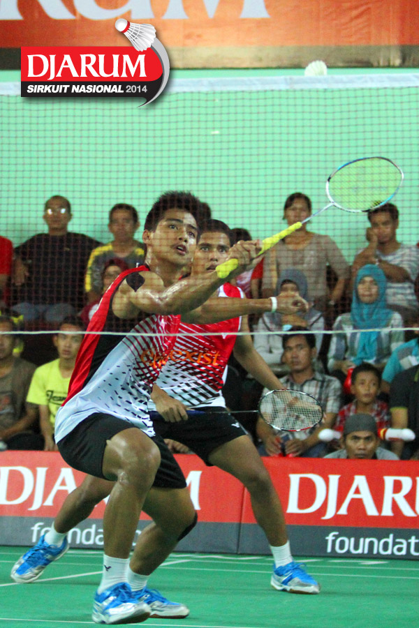 Haffiz Nur Adila/Rehan Naufal (PB Djarum) bersiap menyambar pengembalian dari Andika Vicry/Gatjra Pilliang (Exist)