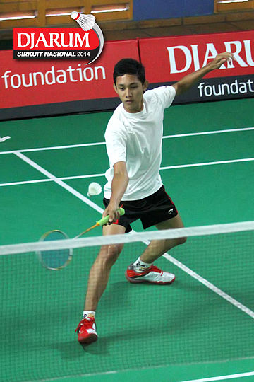 Antonius Chang (Banda Baru Batam) mengembalikan shuttlecock ke arah Rizky Disca (Padaidi).