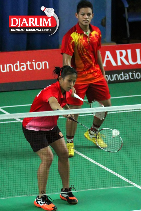 Arsya Isnanu/Deariska Putri (PB Djarum) menyambut serve dari Joko Aji/Novalia Agustianti (Tangkas).