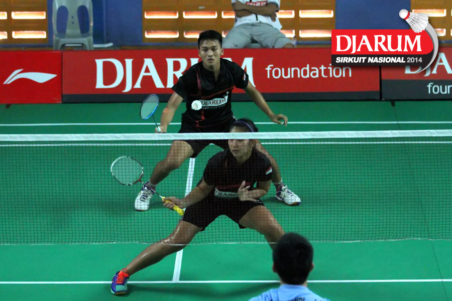 Arsya Isnanu/Deariska Putri (PB Djarum) bersiap menghadang pengembalian dari Joko Aji/Novalia Agustianti (Tangkas).