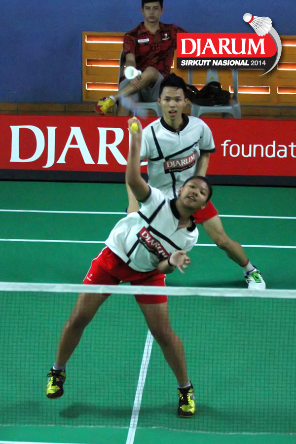 Devand Riefky/Serena Kani (PB Djarum) bersiap mengembalikan shuttlecock kea rah Moh. Shahmi Mat Desa/Nazathul Syuhada (Terengganu Malaysia).