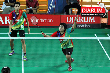 Kuncoro/Meirisa Cindy (Jaya Raya Suryanaga) bersiap menyambut pengembalian dari Vicky Rizky/Rofahadah Supriadi (PB Djarum).