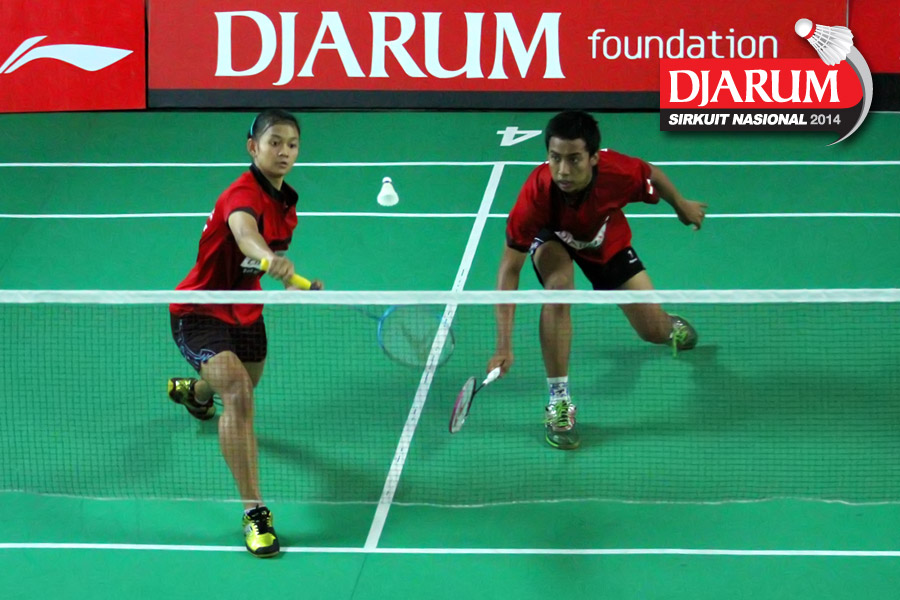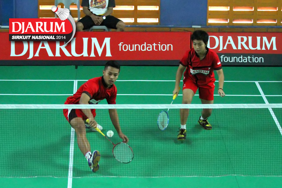 Ridho Bianto/Rahmadhani Hestiyanti (PB Djarum) mengembalikan shuttlecock ke arah Anbiya Bramasta/Bunga Fitriani (Mutiara Bandung).