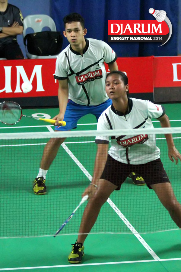 Beno Drajat/Yulfira Barkah (Mutiara Bandung) mengembalikan shuttlecock ke arah Jeka Wiratama/Chintia Rhizta (PB Djarum).