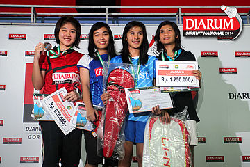 Empat atlet PB Djarum, Tutut Novi, Cynthia Shara, Ramadhani Hestiyanti dan Rofahadah Supriadi (dari kiri) saat di atas podium.