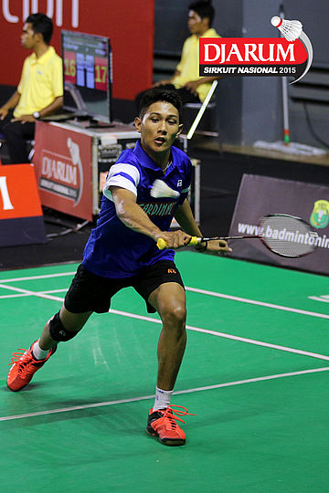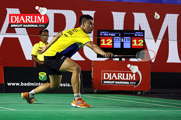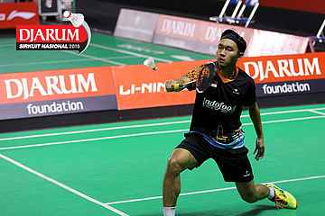Indra Setiawan (Pertamina Fastron) mengembalikan shuttlecock