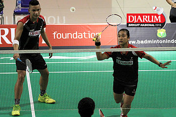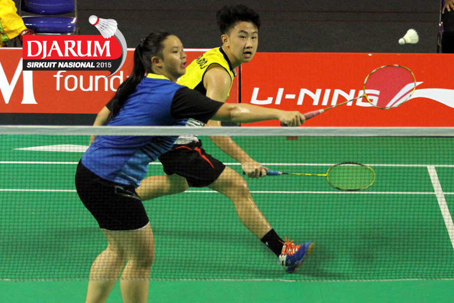 Brian Berri/Lisa Ayu (Djarum Kudus) mengembalikan shuttlecock.