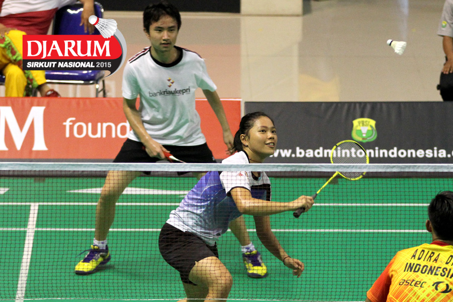 Leonardo/Grace Austin (Bank Riau Kepri Pekanbaru/Angkasa Prestasi) menghadang serangan.