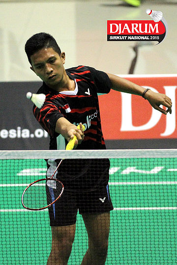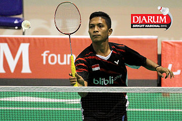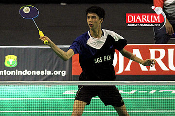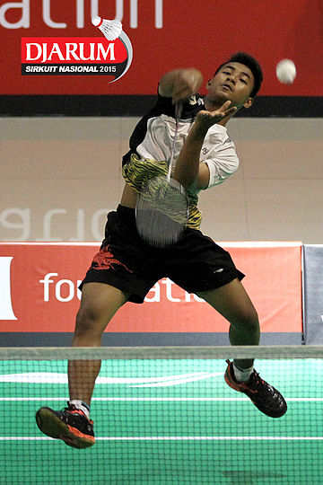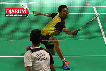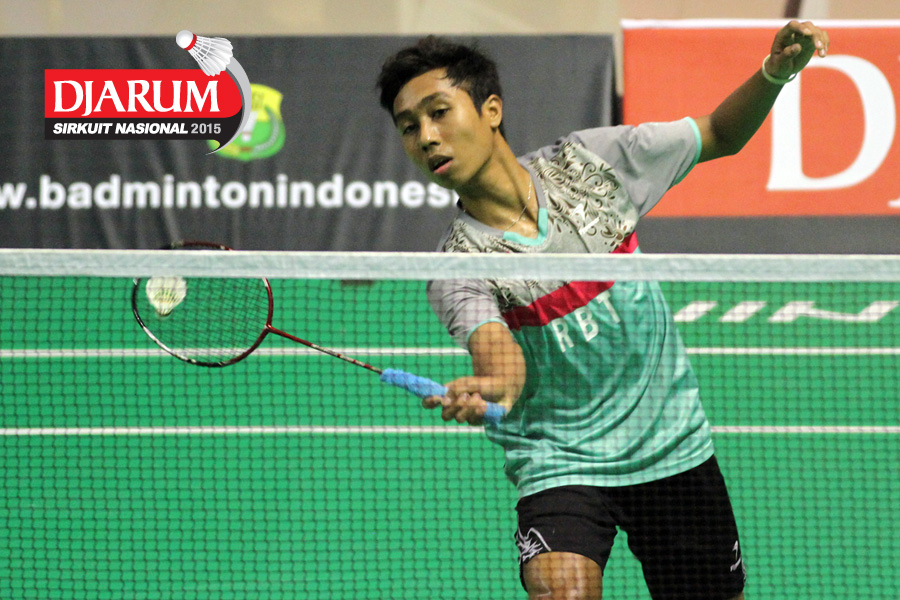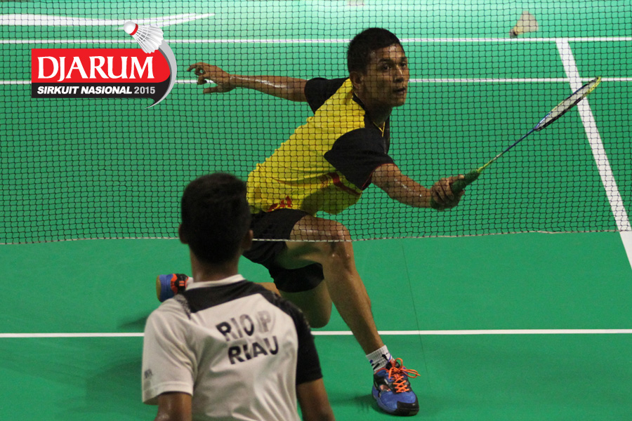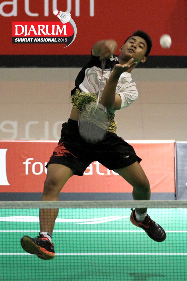 Rio Purwanto (Pusdiklat SMAN Olahraga Riau) mengembalikan shuttlecock.