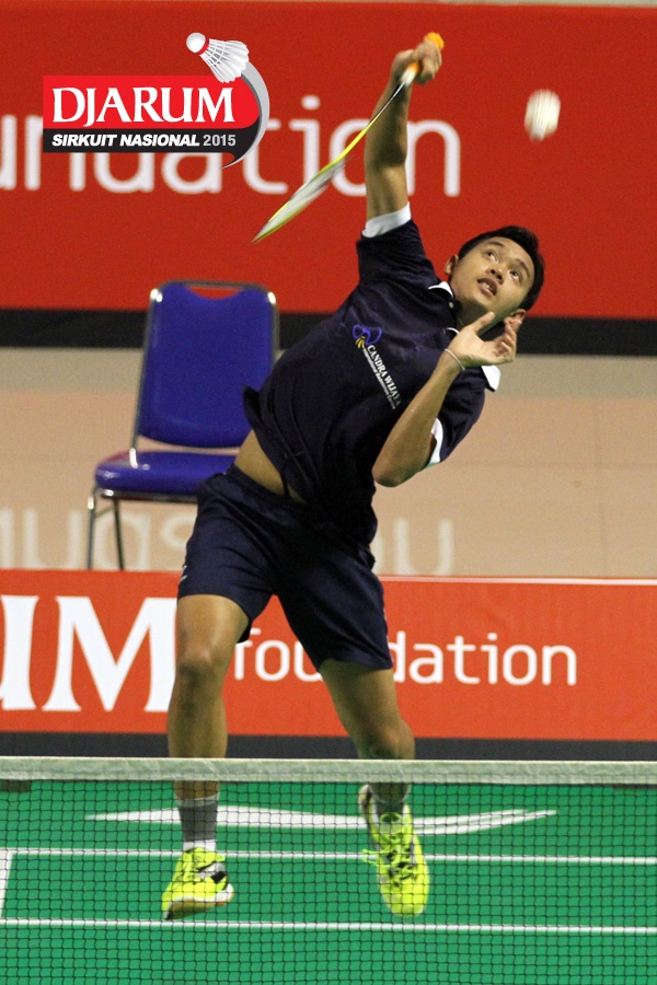 Tri Cahyo (Djarum Kudus) mengembalikan shuttlecock.