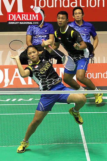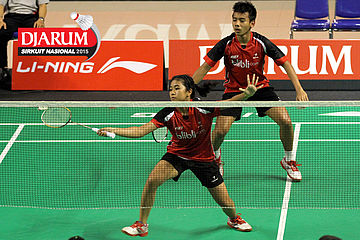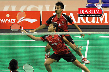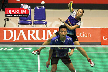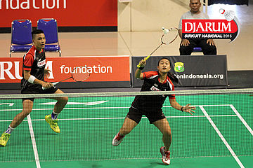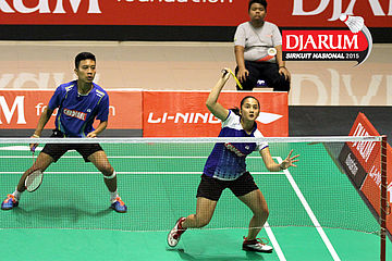 Brian Berri/Lisa Ayu (Djarum Kudus) mengembalikan shuttlecock.