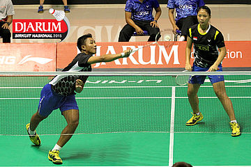 Brian Berri/Lisa Ayu (Djarum Kudus) menggapai pengembalian.